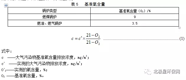 實(shí)測的鍋爐顆粒物、二氧化硫和氮氧化物排放濃度,必須按公式(1)折算為基準(zhǔn)氧含量排放濃度。燃煤鍋爐的基準(zhǔn)氧含量按表5的規(guī)定執(zhí)行。